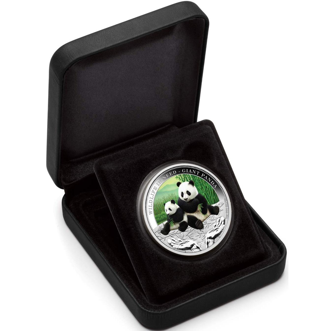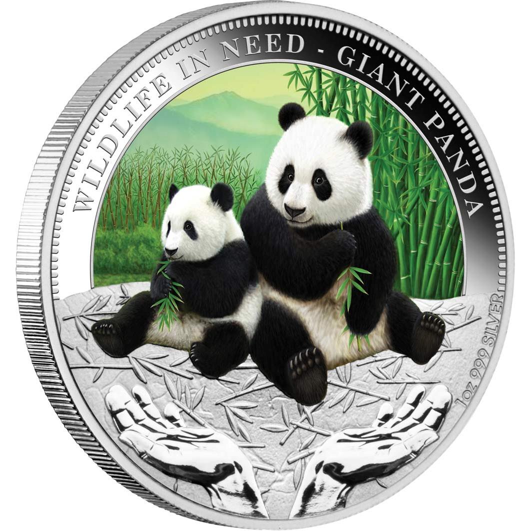 Der Giant Panda ist ein friedfertiges, bambusessendes Mitglied aus der Bärenfamilie und stammt aus China. Er stellt die erste Ausgabe der neuen fünfteiligen Münzserie „Wildlife in Need“ dar. Man erkennt ihn leicht an den großen und markanten schwarzen Flecken um seine Augen, über den Ohren und über seine runden Körper. Der Giant Panda gilt als äußerst gefährdet. Lt. Schätzungen könnten nur noch bis zu 1.500 Exemplare in freier Wildbahn leben.