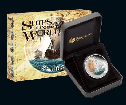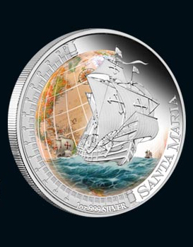 Die Segel des stolzen Dreimasters blähen sich im Wind, der Bug pflügt durch schaumgekrönte Wellen, im Hintergrund ist die Weltkarte zu sehen, die sich durch die Entdeckungsreise des spanischen Schiffes für immer verändert hat: Die „Santa Maria de la Inmaculada Conceptión“, die Kolumbus an die Ufer der neuen Welt brachte, ist ohne Zweifel ein würdiger Auftakt für die Serie „Schiffe, die die Welt veränderten“ der Prägeanstalt The Perth Mint in Australien.