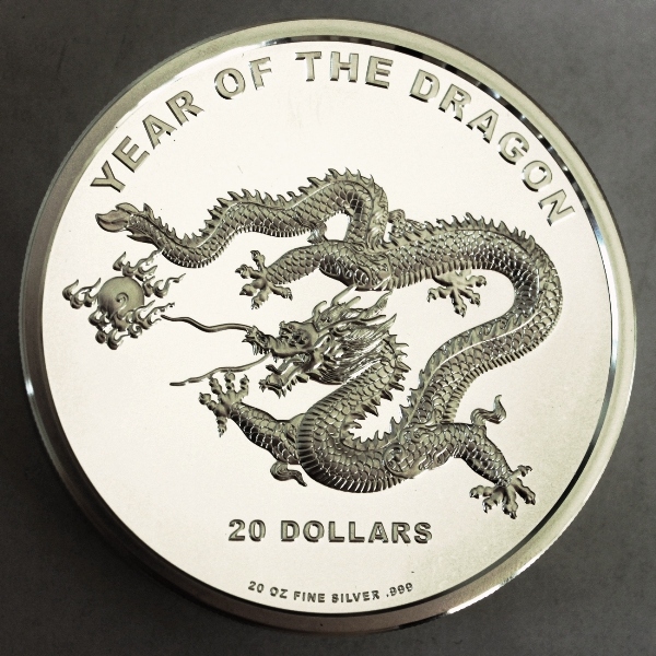 Satte zwanzig Unzen bringt die Silbermünze mit einem Feingehalt von 999/1000 auf die Waage und besticht außerdem durch die Prägung in High Relief. So wirkt der nach chinesischer Tradition schlangenähnlich gestaltete Drache besonders plastisch. Details wie Schuppen treten deutlich hervor. Unter dem Bild ist der Nennwert, 20 Cook Island Dollars, aufgeprägt, darüber befindet sich die Aufschrift „Year of the Dragon“. Umseitig ist ein Portrait Königin Elizabeths II zu sehen, die das offizielle Staatsoberhaupt der südpazifischen Inselgruppe ist.