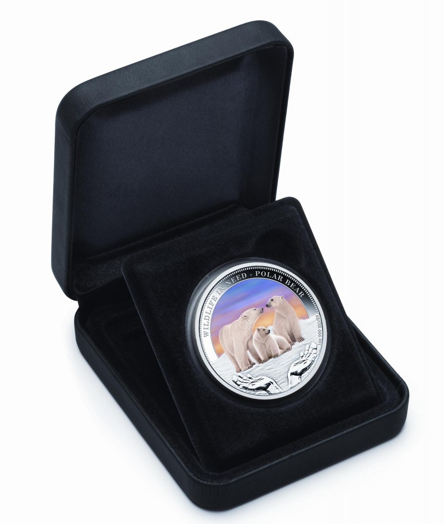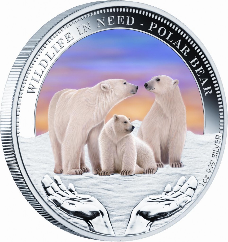 Auf das Schicksal gefährdeter Arten aufmerksam zu machen und gleichzeitig Geld für ihren Schutz zu sammeln ist das Anliegen der „Wildlife in Need“-Silbermünzenserie. Die Silberstücke aus einer Unze 999/1000 reinem Feinsilber werden von der Perth Mint in Proof-Qualität geprägt und lassen durch ihr detailreiches koloriertes Design Sammlerherzen höher schlagen. Pro Münze gehen 1,99 $ als Spende an den WWF. Nach dem Panda und dem Orang Utan widmet sich die dritte Ausgabe der Silberserie 2012 dem Polarbären.