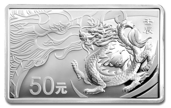 China ist die Heimat der eindrucksvollsten Drachen – zumindest, wenn es um Sammlermünzen geht. Das Design der chinesischen Lunar-Serie ist ein echter Hingucker, nicht nur für Numismatik-Fans. Mit seinem Schlangenleib, den Adlerklauen und der wallenden Mähne zieht der Drache die Blicke auf sich. Details wie die Schuppen sind aufwendig herausgearbeitet. Während dieser Drache von rechts über das Silberrechteck der Münze schreitet, schiebt sich von links ein Drachenkopf in Nahaufnahme ins Bild – feiner gestaltet fällt er erst auf den zweiten Blick ins Auge. Zwischen den beiden Drachendarstellungen findet man die Nennwertangabe von 50 Yuan.