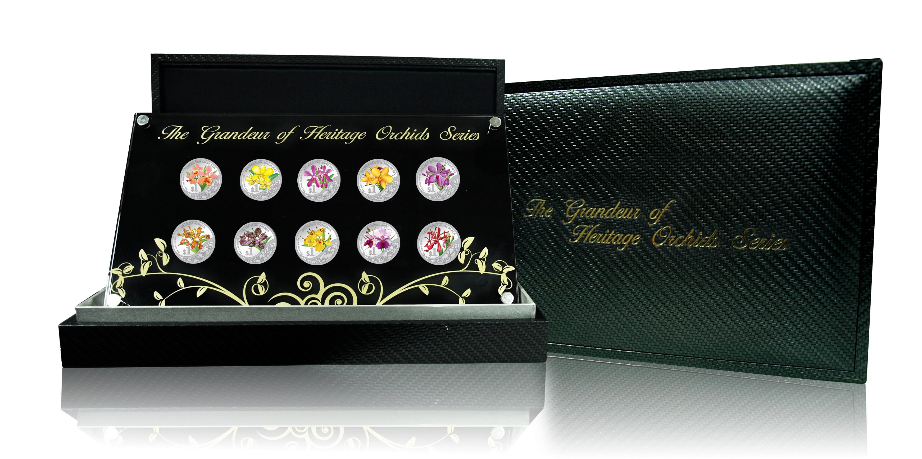 Genau diesen Kriterien der Schönheit, Hochwertigkeit und Dauerhaftigkeit fühlt sich auch die „Grandeur of Heritage Orchids„-Serie der Singapore Mint verpflichtet. Die erfolgreiche Serie lief von 2006 bis 2010, 2011 entschloss man sich, die kolorierten Münzen als exklusives Set herauszugeben. So können sich Münzsammler, die die Serie verpasst haben, jetzt zehn hochwertige Silbermünzen mit dem Motiv jeweils einer Orchideen-Kreuzung auf einmal nach Hause holen. Die Silberstücke mit leuchtender Kolorierung haben ein Gewicht von je 8,56 Gramm und sind aus 999/1000 reinem Feinsilber in Proof-Qualität geprägt. Neben dem Orchideen-Motiv ist der Nennwert von einem Singapur-Dollar aufgeprägt. Weltweit werden nur 8000 der blumigen Sets ausgegeben.
