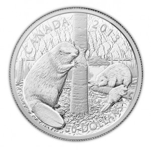 Aus Kanada kommt die Fünf-Unzen-Ausgabe zum Biber. Das detailreiche Motiv zeigt hier eine Biberfamilie beim Bäume fällen. Passend zu der großen Münze gibt es auch eine Ein-Unzen-Version des Bibers mit eigenem Motiv.
