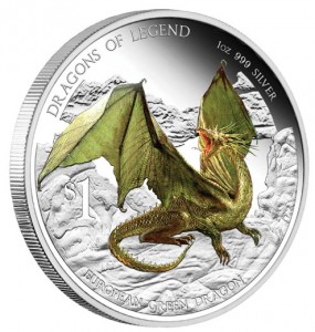 Das Jahr des Drachen ist zu Ende, und passend dazu ist nun auch die letzte Ausgabe der „Dragons of Legend“-Serie der Perth Mint erschienen: der European Green Dragon. Wie seine Vorgänger aus vier verschiedenen Mythologien ist auch dieses Exemplar aus einer Unze Feinsilber in höchster Proof-Qualität geprägt und präsentiert ein mit leuchtenden Farbapplikationen gestaltetes Motiv. Die Auflage beträgt wie bei den vorherigen Editionen 5.000 Stück weltweit. Das letzte Fabeltier der Reihe steht für den Drachen in modernen Geschichten: Statt eines gefährlichen Monsters lernt man den Drachen hier als sprechendes Geschöpf kennen, das ein weiser Berater und Freund des Helden sein kann.