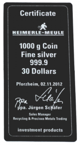 Seit diesem Jahr gibt es auch gegossene Münzbarren von den Cook Islands. Im Gegensatz zu geprägten Barren gelten Gussbarren als weniger empfindlich: Jedes Stück hat eine unverwechselbare, nicht ganz ebene Oberfläche. Die Gussbarren haben einen sehr hohen Feingehalt von 999,9/1000, sodass das Feinsilber später problemlos auch in der Industrie verwendet werden kann. Für die Qualität garantiert mit dem Unternehmen Heimerle + Meule die älteste Silberscheideanstalt Deutschlands. Die Barren werden sicher in Folie verschweißt ausgeliefert.
