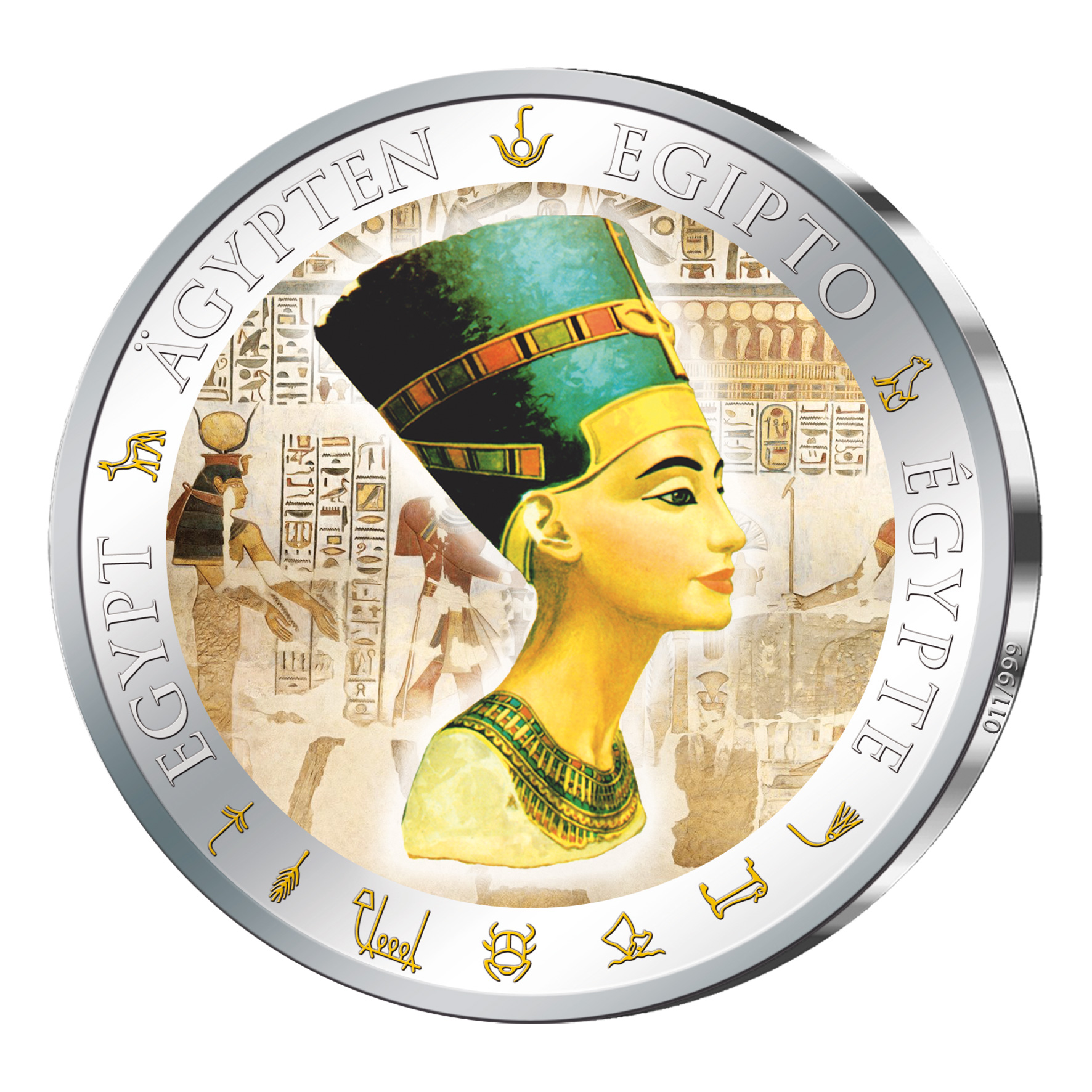 Die schöne Königin ist ebenso berühmt wie geheimnisumwittert. Ihre Herkunft liegt genau wie das Ende ihres Lebens im Dunkeln. Als Hauptgemahlin des Pharaos Amenophis IV., der sich später Echnaton nannte, lebte sie im 14. Jahrhundert v. Chr. Das Paar hatte sechs Töchter, von denen eine später die Frau Tutanchamuns werden sollte. Echnaton verehrteden Sonnengott Aton als höchste Gottheit und errichtete in der Nähe von Amarna seine neue Hauptstadt Achet-Aton. Seine Frau stand ihm in den Regierungsgeschäften zur Seite. Sie wurde sogar in typischen Pharao-Posen dargestellt, zum Beispiel beim Niederschlagen der Feinde. Ob Nofretete nach dem Tod ihres Mannes die Regierung übernahm oder schon vor ihm starb, ist unklar. Ihr Grab wurde nie gefunden. Am 6. Dezember 1912 wurde die berühmte Büste entdeckt, die heute in Berlin steht und die Vorbild für das Motiv der Silbermünze war.