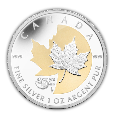 1988 kam die Anlagemünze Maple Leaf aus einer Unze Feinsilber auf den Markt. 99,99 Prozent Feingehalt und der bei einer Anlagemünze ungewöhnlich hohe Nennwert von 5 Dollars machen die Münze mit dem Ahornblatt zu etwas Besonderem auf dem Markt. Zum 25. Geburtstag ihres silbernen Flaggschiffs bringt die Royal Canadian Mint eine Jubiläumsausgabe für Sammler auf den Markt.Das Design der Silbermünze mit einem Durchmesser von 38 Millimetern variiert das bekannte Motiv des Ahornblatts: Im Hintergrund des silbernen Blatts findet sich seine Form in Gold wieder, die dann in einen Halbkreis übergeht. Außerdem beinhaltet das Motiv die zweisprachige Aufschrift 25 yrs (years)/ans, sowie den Feingehalt und das Gewicht von einer Unze. Umseitig zeigt das Sammlerstück dasselbe Portrait von Queen Elizabeth II., das auch auf den ersten Maple Leaf-Ausgaben 1988 zu sehen war.