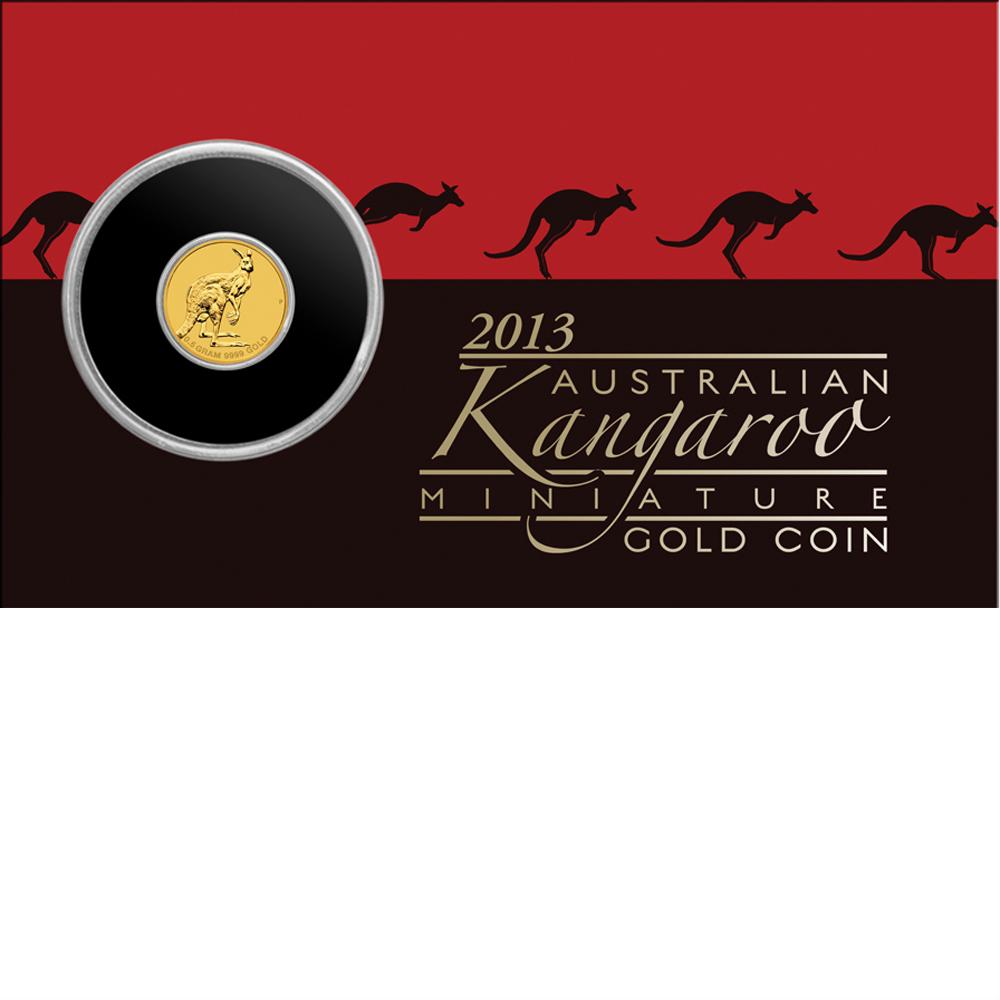 Die kleine Käguru-Münze mit einem Durchmesser von 11,6 Millimetern bei einer Stärke von 0,7 Millimetern ist im Blister verpackt und eingebettet in eine kreditkartengroße Coin Card. Diese ist stilvoll in schwarz und dunklem Rot gehalten und zeigt die Silhouetten springender Kängurus. Außerdem findet man die Aufschrift „2013 Australian Kangaroo Miniture Gold Coin“. Das Mini Roo gilt als gesetzliches Zahlungsmittel mit einem Nennwert von 2 Dollar und zeigt umseitig ein Porträt der Queen.