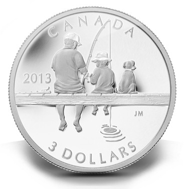 Oft sind die einfachen Momente im Leben die wertvollsten: ein ruhiger See, ein Steg, eine Angel, ein treuer Hund, der aufmerksam Wache hält – und Vater und Sohn in trauter Eintracht nebeneinander: das perfekte Kindheitsidyll, eingefangen von der Royal Canadian Mint auf einer liebevoll gestalteten Silbermünze in Proof-Qualität. Ein schönes Sammlerstück, nicht nur Väter und Söhne.Die Silbermünze wiegt 7,96 Gramm und hat einen Durchmesser von 27 Millimetern. Wie bei der Royal Canadian Mint üblich ist der Feingehalt mit 99,99 Prozent besonders hoch. Auf der Motivseite ist neben den beiden Anglern das Prägejahr 2013 verzeichnet. Der Nennwert ist mit 3 Dollars angegeben. Umseitig zeigt das Sammlerstück, das als gesetzliches Zahlungsmittel dient, ein Portrait der Queen.
