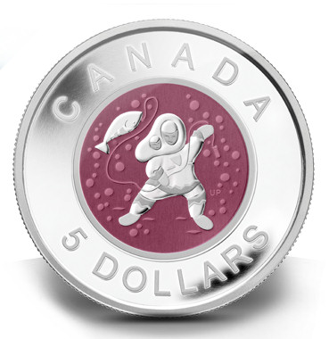 Kanada5CADNiob2013 Münzsammler  halten mit dieser Neuausgabe der Royal Canadian Mint ein Stück Kanada in den Händen. Die neue Serie von Silbermünzen mit farbigem Niob-Kern präsentiert traditionelle Motive, die von Inuit-Künstlern gestaltet werden. Die erste Ausgabe zeigt eine Mutter mit Baby in der arktischen Wildnis, die gerade Fisch für ihre Familie fängt. Die Auflage liegt bei nur 6.500 Stück.Energisch zieht die Inuit-Frau an der Angelschnur, an der ein großer silberner Fisch baumelt. Das Baby ist warm eingepackt im Mantel der Mutter, dem amautik. Dieses traditionelle Kleidungsstück der Ureinwohner des Nordens hat eine eingebaute Tragevorrichtung für das Kind. Das dynamische Motiv ist in modernem Stil und mit fließenden Linien gestaltet und hebt sich in Silber vom farbigen Niob-Hintergrund ab.