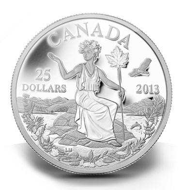 Statt eines Dreizacks hält sie einen Stab mit einem Ahornblatt in der Hand, ihr Kopf ist ebenfalls mit dem symbolischen Laub umkränzt, ansonsten erinnert Miss Canada in ihrem römischen Gewand aber eindeutig an eine antike Göttin – ganz wie ihre „große Schwester“ Britannia. Die Royal Canadian Mint holt die allegorische Darstellung der Nation jetzt aus der Schublade auf eine Sammlermünze aus einer Unze Feinsilber, die in höchster Proof-Qualität geprägt wird.Lange war Miss Canada als Darstellung des Landes in Illustrationen, Werbung, Politik und Karrikaturen verbreitet, doch nach dem Zweiten Weltkrieg kam die ursprünglich als Tochter der Mutter Britannia entworfene Figur aus der Mode. Die Designer der kanadischen Prägeanstalt haben sie für ihr Comeback in Silber in ein modernes Motiv platziert: Umgeben von unberührter Natur sitzt sie auf ihrem Felsen. Fluss, Berg und Wald sind zu sehen, rechts fliegt direkt über dem Prägejahr ein Adler durchs Bild, während darunter ein Fisch aus dem Wasser springt. Links findet man den Nennwert von 25 Dollars und in der unteren Hälfte zieht sich eine Girlande aus mehr als 25 Blattarten, die in Kanada vorkommen, am Rand entlang.