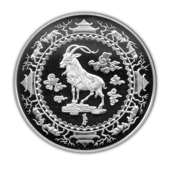 Im Zentrum der Silbermünze steht ein wachsam aufgerichteter Ziegenbock mit eindrucksvollen, geschwungenen Hörnern. Auf dem äußeren Ring des Motivs ist das sich wiederholende Bild von zwei kämpfenden Ziegenböcken zu sehen, dazwischen jeweils ein von Bäumen flankierter Tempel. Umseitig findet man den Nennwert von 500 Tögrög. Ziegen gelten im chinesischen Horoskop als besonders gutherzig und mitfühlend, aber auch sehr sensibel.