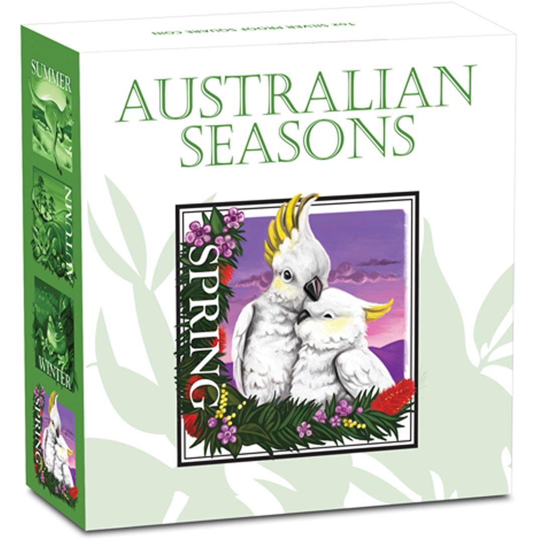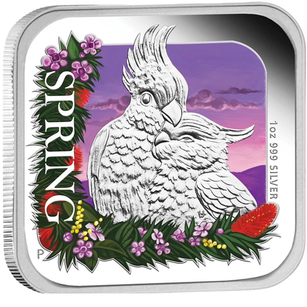 Während wir die letzten schönen Tage des Sommers genießen, freuen sich die Australier auf den Frühling, eine bunte und ereignisreiche Jahreszeit: Die Natur erwacht zu neuem Leben, überall erblühen farbenfrohe Blüten, zahlreiche Tierkinder erblicken das Licht der Welt. Für die Münzserie „Australian Seasons“ haben die Designer den australischen Frühling mit leuchtenden Farbapplikationen auf einer quadratischen Silbermünze eingefangen.Im Zentrum des Motivs steht ein Kakadu-Pärchen, das sich verliebt aneinander schmiegt. Dank der Proof-Prägung sind die Details des Federkleids besonders schön zu sehen. Den Rahmen für das Vogelpaar bilden grüne Blätter und große rote Banksien-Blüten, die sich mit kleinen zartvioletten Blüten der Wachsblume abwechseln. Deren Farbe findet sich im Hintergrund am farbenprächtigen Abendhimmel wieder. Rechts findet man am Rand des kolorierten Bereichs die Angabe zum Feingewicht von 1 oz und dem Feingehalt von 999/1000.