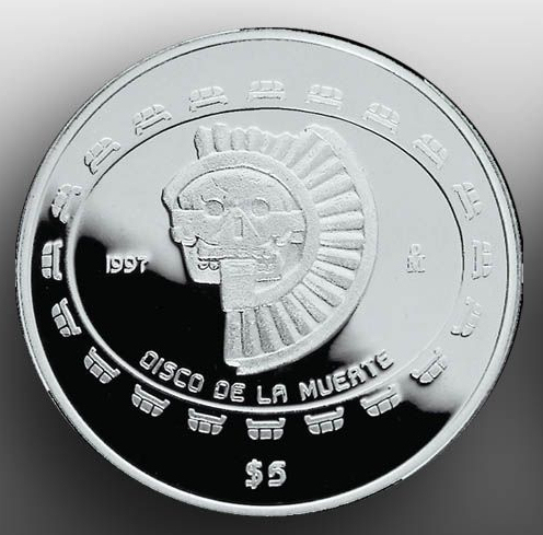 Die Silbermünzen-Serie „precolumbina“ aus Mexiko erinnert an die mittelamerikanischen Hochkulturen aus der Ära vor Kolumbus. Aztecen, Mayas, Olmeken, Tolteken, die Kultur von Teotihuacan und del Centro de Veracruz lieferten faszinierende Motive für die hochwertigen Sammlerstücke in Proof-Prägung, die in verschiedenen Stückelungen erschienen. Eine Münze von 1997 zeigt die Disco de la muerte, die von den Azteken gefertigt und in Teotihuacan gefunden wurde.Die Skulptur, die im Original etwa 126 Zentimeter hoch ist, ist heute im Museo Nacional de Antropología in Mexiko-Stadt ausgestellt. Sie wurde nahe der Sonnenpyramide, der größten Pyramide der ehemaligen Metropole Teotihuacan, entdeckt. Sie stammt nicht aus der Blütezeit der Stadt, die im 7. Jahrhundert zu Ende ging, sondern aus einer späteren Periode (1200 bis 1521), als die Ruinen von Teotihuacan für die Azteken von großer Bedeutung waren. Sie gaben ihr ihren Namen, der in ihrer Sprache „der Ort, wo man zu einem Gott wird“ bedeutet.
