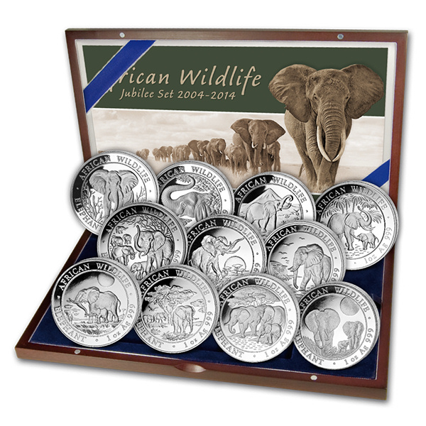 ElefantenSatz2004-2014Zehn Jahre – elf Silbermünzen: Die African Wildlife Elephant feiert zehnjähriges Jubiläum und zu diesem Anlass gibt es nun alle bisherigen Ausgaben der Anlagemünze als Set, eingebettet in ein stilvolles Etui aus Holz. Jede Silbermünze zeigt ein unterschiedliches, liebevoll gestaltetes Elefantenmotiv – eben deshalb sind die „Elefanten“ auch bei Münzsammlern beliebt. Jede der elf Münzen enthält 1 oz Feinsilber und wurde vom Bayerischen Hauptmünzamt geprägt.Während die ersten Ausgaben noch ganz von einem einzelnen großen Rüsselträger beherrscht werden, geht der Trend in den letzten Jahren immer mehr zur „Familie“: Elefantenherden mit mehreren Erwachsenen und einem Jungtier zeigen die Editionen 2011, 2012, 2013 und auch die Jubiläumsausgabe 2014. Das entspricht auch der Lebensweise der Afrikanischen Elefanten: Meistens führen erfahrene Kühe eine Herde an, die aus ihren weiblichen Verwandten und deren Jungtieren besteht. Die kleinen Bullen müssen die Herde im Teenageralter verlassen und schließen sich dann mit anderen „Junggesellen“ zusammen.