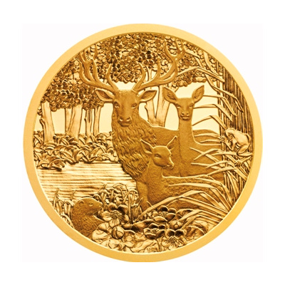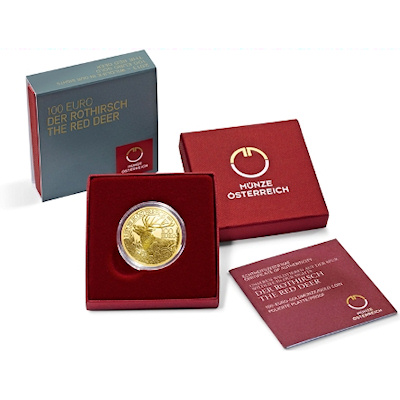 Die Goldmünze hat einen Durchmesser von 30 Millimetern, das Feingewicht liegt bei 16 Gramm. Das Sammlerstück hat einen Feingehalt von 986/1000 und wird in Proof-Qualität geprägt. Zum Lieferumfang gehört auch die Umverpackung in stilvollem Weinrot. Insgesamt werden 30.000 Goldmünzen mit dem Rothirsch ausgegeben.