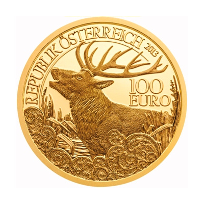Die Wertseite der Goldmünze zeigt einen röhrenden Platzhirsch im Profil. Rothirsche gehören in Österreich und Deutschland zu den größten einheimischen Tierarten, sie können über zwei Meter lang werden und haben eine Rückenhöhe von bis zu 1,5 Metern. Hirsche sind größer und schwerer als die Hirschkühe und schleppen je nach Alter und Entwicklung ein Geweih mit sich herum, das über 20 Kilogramm wiegen kann. Im unteren Bereich des Motivs ist eine ornamentale Verzierung zu sehen, das verbindende Element der Serie.