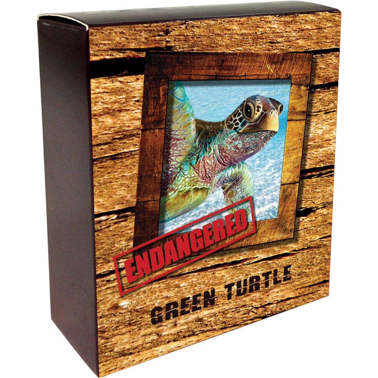 Münzsammler holen sich mit der Green Turtle nicht nur ein seltenes, sondern auch ein besonders schönes Stück nach Hause: Die in Proof-Qualität geprägte Silbermünze begeistert besonders durch die leuchtenden Farbapplikationen und das dynamische Motiv der schwimmenden Schildkröte. Sie enthält 1 oz Feinsilber bei einem Feingehalt von 999/1000 und hat einen Durchmesser von 40,6 Millimetern. Der Nennwert beträgt einen Dollar. Ausgeliefert werden die silbernen Sammlerstücke im Etui und mit Umverpackung.