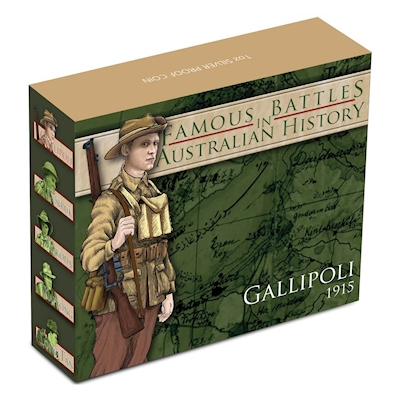 Die Silbermünze zeigt einen Soldaten in der Ausrüstung der Zeit. Der kolorierte Hintergrund stellt die felsigen Strände Gallipolis dar. Die Silbermünzen in höchster Prägequalität polierte Platte mit einem Gewicht von einer Unze und einer Reinheit von 999/1000 gelten als offizielles Zahlungsmittel in Australien und verfügen über einen aufgeprägten Nennwert. Auf der Vorderseite ist ein Portrait der Königin Elizabeth II zu sehen, des offiziellen Staatsoberhauptes von Australien. Die Münzen werden in Etui und Geschenkkarton im Seriendesign mit nummeriertem Echtheitszertifikat geliefert.