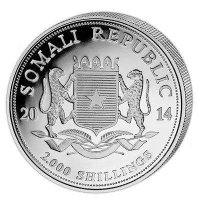2000-Sh-1-kg-Ag-Elephant-2014-RSAuf der Wertseite findet man neben dem Nennwert von 200 Shillings das Wappen der Republik Somalia: Zwei aufgerichtete Leoparden halten einen Schild mit einem silbernen Stern. Die beiden Tiere stehen ihrerseits auf zwei gekreuzten Speeren unter zwei Palmwedeln.