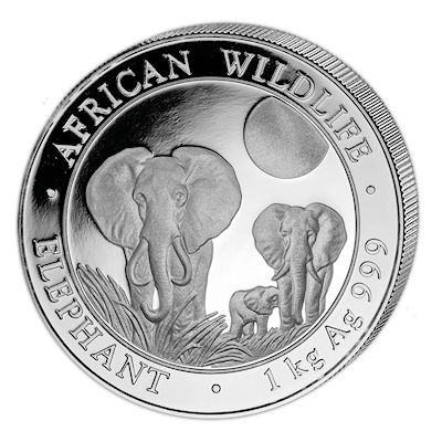 2000-Sh-1-kg-Ag-Elephant-2014-VSEine perfekte Verbindung von Geldanlage und Sammlerstück – der African Wildlife Elephant ist eine doppelt gute Investition. Geprägt aus einem Kilogramm Feinsilber (Feingehalt 999/1000) in Stempelglanzqualität  kommt jetzt die Ausgae 2014 der beliebten Anlagemünze mit wechselndem Motiv auf den Markt. Eine Elefantenherde zieht durch eine Graslandschaft und kommt dabei direkt auf den Betrachter zu: Für dieses Motiv haben sich die Designer diesmal entschieden. Neben dem großen Elefanten im Vordergrund ist im Hintergrund ein weiterer mit einem Jungtier zu sehen – vielleicht die Großmutter, die vorneweg geht, während Mutter und Nachwuchs ihr vertrauensvoll folgen? Das bleibt der Fanatsie der Anleger und Münzsammler überlassen.