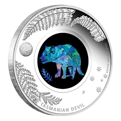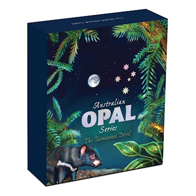 opal-tasmanian-devil-etuiWie viele weitere Vertreter der Tierwelt Australiens ist der Beutelteufel nachtaktiv; deshalb passt er gut in die Opal-Serie. Die Sammlermünzen werden in höchster Proof-Qualität geprägt. Der Gesamtdurchmesser der Silbermünze mit einem Feingehalt von 999/1000 beträgt 36,6 Millimeter und unterteilt sich in die Opal-Scheibe in der Mitte und einen silbernen Rand. Auf dem silbernen Rand findet man Angaben zu Prägejahr, Reinheit und Gewicht. Der Mond, das Sternbild „Kreuz des Südens“ und einige Baumfarnzweige bilden den Rahmen für das Tiermotiv. Umseitig zeigt die Silbermünze, die als gesetzliches Zahlungsmittel in Australien gilt, ein Porträt der Queen.