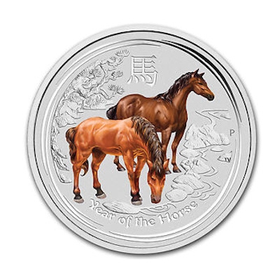 lunarII-perd-koloriert-1-ozMit bunten Feierlichkeiten begrüßte China am 31. Januar 2014 das Jahr des Pferds. Ebenso farbenfroh zeigt sich eine neue Ausgabe der australischen Lunar II Serie: Hochwertige Kolorierung lässt das Pferdemotiv noch lebendiger erscheinen und macht diese Edition aus 1 oz Feinsilber zu einem besonders schönen Sammlerstück für Lunar-Fans und alle, die unter dem Zeichen des dynamischen und leidenschaftlichen Pferdes geboren sind.Nach dem Drachen steht das Pferd als glücksbringendes Tierkreiszeichen an zweiter Stelle. „Pferde“ gelten als stürmisch und leidenschaftlich, was zumindest nach dem chinesischen Horoskop ein ereignisreiches Jahr verspricht. Das Motiv der in höchster Proof-Qualität geprägten Silbermünze zeigt zwei braun kolorierte Rösser in einer stilisierten chinesich anmutenden Landschaft mit Bäumen, Felsen und Fluss. Eines der Pferde hat den Kopf gesenkt um zu trinken, während das andere Ausschau zu halten scheint. Mittig über den beiden Tieren ist das chinesische Schriftzeichen für Pferd zu finden, unten am Rand die Aufschrift „Year of the Horse„. Umseitig finden die Münzsammler wie üblich ein Portrait der Queen, des offiziellen Staatsoberhaupts von Australien.