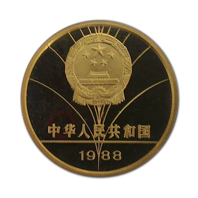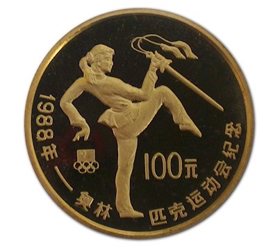 Eleganz und Kraft vereinen sich in der Figur, die auf einem Bein stehend das Schwert hebt. Unterhalb der linken Hand sind die olympischen Ringe zu sehen, unter dem rechten Fuß der Nennwert von 100 Yuan. Die Goldmünze hat einen Durchmesser von 27 Millimetern und enthält 1/2 oz Feingold bei einem Feingehalt von 999/1000. Sie wurde in höchster Proof-Qualität geprägt und mit Zertifikat ausgegeben.