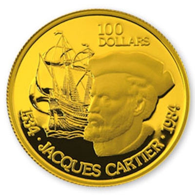 Dem Namen Jacques Cartier begegnet man in Kanada häufiger, etwa als Straßenname in Montreal oder im Namen des höchsten Berges von Québec, des Mont Jacques-Cartier. Der französische Seefahrer landete im Jahr 1534 zum ersten Mal auf dem Gebiet des heutigen Kanada. 450 Jahre später gab die Royal Canadian Mint zum Andenken an den Entdecker eine Goldmünze heraus, die ein Portrait Cartiers ziert.