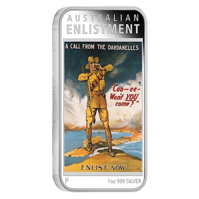 Am 28. Juli 1914, vor bald 100 Jahren, begann der Erste Weltkrieg, der bis dahin umfassendste Konflikt der Geschichte. Das Jahr 2014 steht ganz im Zeichen dieses traurigen Jubiläums – auch bei den Prägeanstalten. Die Perth Mint startet aus diesem Anlass eine fünfteilige Serie von Silbermünzen in rechteckiger Form, die in aufwendigen Farbapplikationen Poster des australischen Militärs zeigen.Mit der Kriegserklärung vom 4. August 1914 trat Großbritannien auf der Seite Frankreichs und Russlands in den Krieg ein. Australien, obwohl seit 1907 fast vollständig unabhängig von den Briten, fühlte sich zur Entsendung von Soldaten verpflichtet. Die Zahl der Freiwilligen ließ jedoch stark nach, nachdem die australischen Truppen die ersten großen Verluste zu vermelden hatten. Ein Wendepunkt war dabei die blutige Schlacht von Gallipoli. Mit Werbeaktionen versuchte das Militär, weitere Soldaten für die Entsednung nach Europa zu gewinnen. Verschiedene Poster der Zeit wurden für die Silbermünzen-Serie ausgewählt.