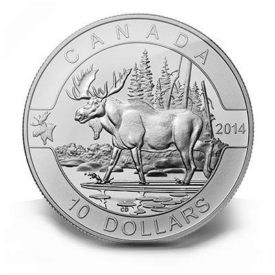 Links zeigt das Motiv einen stilisierten Elch-Kopf, unten ist der Nennwert von 10 Dollars verzeichnet. Die Silbermünze hat einen Durchmesser von 34 Millimetern und einen Feingehalt von 99,99 Prozent.