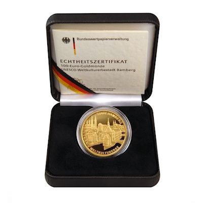 Mitten in der Regnitz steht das Alte Rathaus in Bamberg als kuriose Schönheit in einer Stadt, die mit einer Fülle historischer Bauten begeistert. Deshalb wurde auch die ganze Altstadt ins Weltkulturerbe der UNESCO aufgenommen. Und mit seinem markanten Wahrzeichen lieferte Bamberg auch gleich ein ideales Motiv für die 100-Euro-Goldmünzenserie der Bundesrepublik Deutschland. Nach Quedlinburg wurde die Serie zu den deutschen Welterbestätten damit weitergeführt.