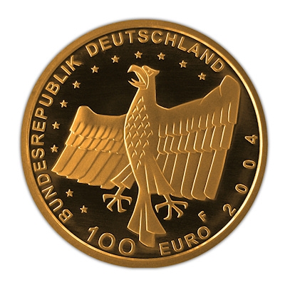 Auf der Wertseite ist der Bundesadler in etwas ungewöhnlicher perspektivischer Darstellung aufgeprägt. Er ist umgeben von zwölf Sternen für die ursprünglichen Euro-Staaten. Die Münze aus 1/2 Unze Feingold hat eine Reinheit von 999,9/1000. Der Durchmesser beträgt 28 Millimeter. Ausgeliefert wurde die Goldmünze, die in allen fünf deutschen Prägestätten hergestellt wurde, im Etui und mit nummeriertem Echtheitszertifikat.