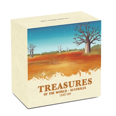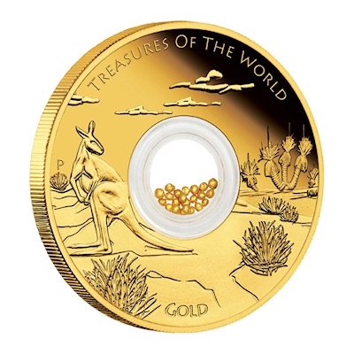 treasures-of-the-world-australia-goldDie Schätze der Welt präsentiert die Perth Mint in einer jährlichen Serie von Medaillon-Goldmünzen. Nachdem die erste Ausgabe im letzten Jahr dem Kontinent Europa und dem Granat gewidmet war, folgt dieses Jahr ein „Heimspiel“: Als edles Symbol für den australischen Kontinent sind 0,2 Gramm kleine Goldstückchen in das Fenster der Münze eingebettet, die selbst 1 oz Feingold enthält.treasures-of-the-world-australia-gold-etuiAustralien ist das Land mit der zweitgrößten Goldfördermenge der Welt. Seit dem Goldrausch in den 1850er Jahren hat das Metall eine große Bedeutung für den Staat – nicht nur wegen seines Geldwertes. Erst durch die Goldfunde, die viele Einwanderer anzogen, wurde Australien von einer Strafkolonie des britischen Empires zu einem eigenständigen Staat. Noch heute werden hier von Hobbygräbern bisweilen große Goldklumpen entdeckt.