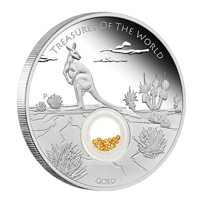 Jetzt gehen Silber-Sammler unter die Goldgräber: Eingebettet in eine Medaillon-Münze aus 1 oz Feinsilber präsentiert die Perth Mint 0,2 Gramm Goldsplitter. Sie stehen als Symbol für den Kontinent Down Under in der Münzserie „Treasures of the World“ die im letzten Jahr mit der Ausgabe Europa startete. Münzsammler dürfen sich auch diesmal wieder über ein schön gestaltetes Schmuckstück mit einer sterng auf 7.500 Stück limitierten Auflag freuen.