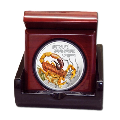 Die neunte Ausgabe der Erfolgsserie „Deadly & Dangerous“ aus Australien ist auf dem Markt. Jedes Jahr erscheint eine der leuchtend kolorierten Silbermünzen, die den giftigen, gefährlichen Bewohnern des Lands Down Under gewidmet sind. Im maßgeschneiderten Holzetui lassen sich die Sammlerstücke exzellent in Szene setzen. Die neueste Ausgabe der unter Münzsammlern sehr beliebten Reihe ist der Spider-Hunting Scorpion.