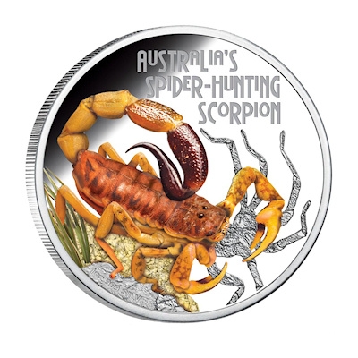 In Australien gibt es rund 80 verschiedene Arten von Skorpionen – keine davon ist für den Menschen lebensgefährlich. Der Spider-Hunting Scorpion auf der Silbermünze erweist sich jedoch seinem Namen entsprechend als tödliche Gefahr für eine Spinne, die er bereits erbeutet hat. Diese Art kommt hauptsächlich in trockenen Regionen in der Südhälfte Australiens vor und hat sich möglicherweise auf die Jagd auf Wolfsspinnen spezialisiert. Sein besonders dickes, kraftvolles Hinterteil ist auf dem kolorierten Motiv gut zu erkennen.