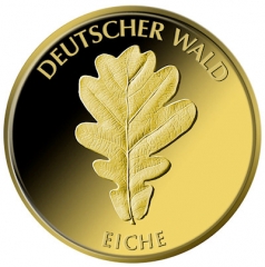 Als die Bundesrepublik Deutschland anlässlich des Jahrs der Wälder eine Serie von Goldmünzen startete, fiel die Wahl für die erste Ausgabe wohl nicht schwer: Die Eiche gilt seit Jahrhunderten als deutscher Nationalbaum. Orden, Münzen, Statuen – nach der Reichsgründung 1871 war das Eichenlaub überall zu finden. Auch diese Münze mit dem ungewöhnlichen Feingewicht von 1/8 Unze ist mit einem Eichenblatt geschmückt.