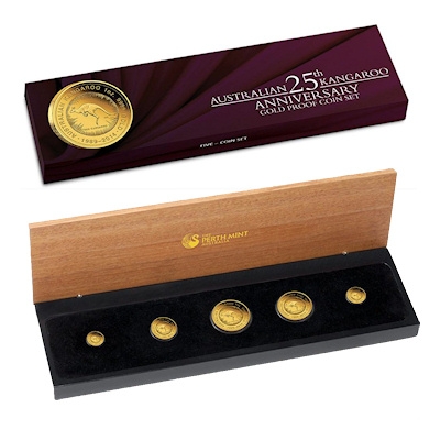 Die Jubiläums-Goldmünzen zeigen das originale Design von Stuart Devlin aus dem Jahr 1989, das den Grundstein für diese außerordentlich erfolgreiche Serie mit wechselndem Motiv legte. Es stellt ein Rotes Riesenkänguru im Sprung umgeben von einem Kranz aus Sonnenstrahlen dar. Unter dem Tier sind die Worte „Red Kangaroo“ zu lesen, am Rand entlang Angaben zu Feingehalt und Prägejahr, wobei das Prägejahr mit 1989-2014 verzeichnet ist und dem Zeichen der Prägeanstalt noch die Jahreszahl 25 hinzugefügt wurde. Dieses „P25“ ist unterhalb des Schwanzes zu finden. Umseitig zeigen die in Proof-Qaulität geprägten Goldmünzen als gesetzliches Zahlungsmittel Australiens ein Portrait der Queen. Der Feingehalt liegt bei 99,99 Prozent.