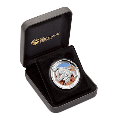 australian-megafauna-megalania-silber-shipperDie Silbermünze, die in höchster Proof-Qualität geprägt ist, zeigt Megalania, wie er direkt auf den Betrachter zustürmt. Der Hintergrund ist mit aufwendigen Farbapplikationen gestaltet. Die Silbermünze enthält 1 oz Feinsilber (Feingehalt 999/1000) und trägt einen Nennwert von einem Dollar. Der Durchmesser liegt bei 40,6 Millimetern. Das Sammlerstück kommt im Etui und einer schönen Umverpackung im Seriendesign zum Münzsammler. Ein nummeriertes Echtheitszertifikat gehört zum Lieferumfang. Die Auflage ist limitiert auf 6.500 Silbermünzen weltweit.