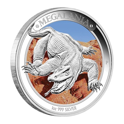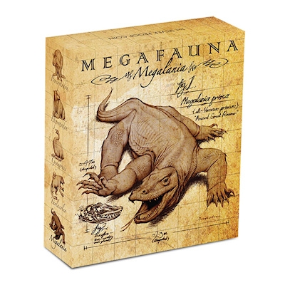 australian-megafauna-megalania-silberSieben Meter lang, bis zu 1000 Kilogramm schwer: Megalania war ein Gigant unter den Waranen, aber nur eines von zahlreichen riesigen Wirbeltieren, die während des Pleistozäns in Australien lebten. Diese „Megafauna“ ist Thema einer fünfteiligen Serie von Silbermünzen der australischen Perth Mint. Nach Procoptodon, Diprotodon, Genyornis und Thylacoleo bildet der Riesenwaran den Abschluss der beliebten Reihe.