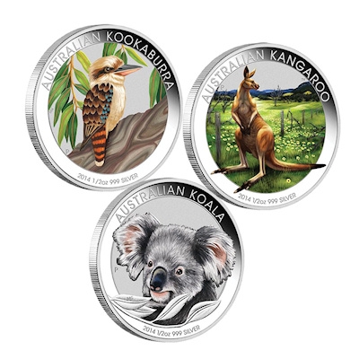Jedes Motiv ist liebevoll ausgearbeitet: Der junge Kookaburra sitzt auf einem kräftigen Ast und ist umgeben von grünen Blättern; seine Federn sind fein gezeichnet. Das Känguru ist auf Farmland unterwegs. Direkt hinter ihm verläuft ein Zaun, Wildblumen wachsen zu seinen Füßen und im Hintergrund sind Bäume und Hügel zu sehen. Der Koala schließlich ist im Portrait abgebildet. Bei dieser Silbermünze bilden silberne Eukalyptusblätter den Vordergrund für das kolorierte Bild. Die ausgewählten Motive entsprechen dem Design der jeweiligen Anlagemünzen 2014. Im Gegensatz zum Australian-Outback-Set 2013 sind diesmal Tiere und Hintergrund mit Farbapplikationen gestaltet.