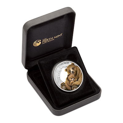mothers-love-brown-bear-silber-etuiBraunbärbabys erblicken während der Winterruhe das Licht der Welt und bleiben die ersten Monate mit der Mutter in der Höhle. Bei der Geburt sind sie nur wenige hundert Gramm schwer, aber dank der reichhaltigen Muttermilch nehmen sie rasch zu. Meistens sind es zwei bis drei Geschwister pro Wurf. Wie auf der Silbermünze zu sehen, kümmert sich die Mutter allein um den Nachwuchs. Bis zu vier Jahre lang sorgt die Braunbärin für die Jungen, zeigt ihnen Nahrungsquellen und Jagdtechniken.