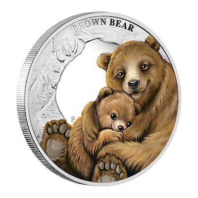 mothers-love-brown-bear-silber-shipperDie Silbermünze mit einem Durchmesser von 36,60 Millimetern wird aus einer halben Unze Feinsilber mit einem Feingehalt von 999/1000 geprägt. Ausgabeland  ist der Inselstaat Tuvalu, umseitig ist ein Porträt von Königin Elizabeth II zu finden ist. Der Nennwert beträgt 50 Cent.
