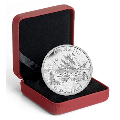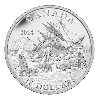 Bereits im 16. Jahrhundert, nachdem Magellan entdeckt hatte, dass man Südamerika umschiffen konnte, begann die Suche nach einer Passage im Norden, einer kürzeren Verbindung für europäische Schiffe. Doch das Nordpolarmeer erwies sich als unwirtlicher und gefährlicher als gedacht. Schiffe froren für Jahre fest oder wurden vom Packeis zerquetscht, Expeditionen verschwanden fast spurlos. Oft war die Hilfe der Inuit die letzte Überlebenschance für die Seeleute: Sie wussten, wie man sich in der Eiswüste ernähren und überleben konnte. Die Silbermünze greift diese Geschichten auf: Sie zeigt ein eingefrorenes Schiff im Hintergrund. Männer sind damit beschäftigt, Proviant abzuladen. Im Vordergrund kommen ihnen Inuit mit einem Hundeschlitten zu Hilfe.