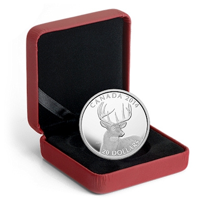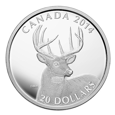 canada-weisswedelhirsch-1-oz-silberDer Weißwedelhirsch ist die am weitesten verbreitete Wildart Nordamerikas. Die Royal Canadian Mint widmet den eleganten Tieren jetzt eine Serie von vier Silbermünzen, die zwischen August und November 2014 ausgegeben werden. Das erste Sammlerstück aus 1 oz Feinsilber zeigt einen männlichen Weißwedelhirsch im Profil, wobei das gebogene Geweih besonders gut zur Geltung kommt.