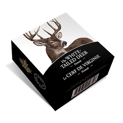 canada-weisswedelhirsch-1-oz-silber-shipperDie erste der vier geplanten Silbermünzen zeigt den ausgewachsenen Hirsch mit eindrucksvollem Geweih. Sie ist in höchster Proof-Qualität aus 1 oz Feinsilber geprägt und hat einen Feingehalt von 99,99 Prozent. Der Durchmesser beträgt 38 Millimeter. Eine Besonderheit ist die Randbeschriftung: Hier findet man Feingehalt und Gewicht als erhabene Schrift. Ausgeliefert werden die Münzen im Etui und mit passender Umverpackung, die ebenfalls einen Weißwedelhirsch zeigt. Die Auflage ist begrenzt auf 7.500 Exemplare weltweit.