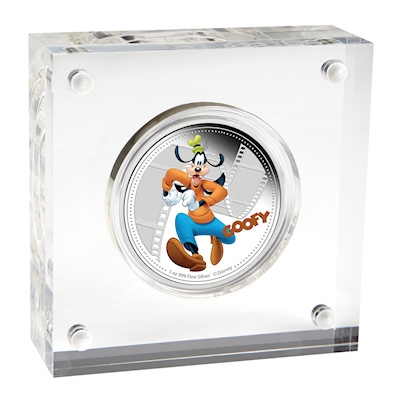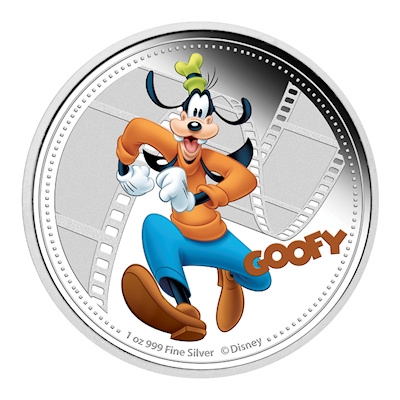 Voller Enthusiasmus stürmt der ungelenke Hund auf dem Motiv der Silbermünze dem Betrachter entgegen. Wer ihn kennt, wartet schon darauf, dass er im nächsten Moment auf haarsträubende Weise zu Fall kommt. Goofy ist der ewige Tollpatsch unter den Disney-Figuren – und das schon seit 1932. Im Laufe der Zeit hat Goofy schon viele Rollen gespielt: als Freund von Donald und Micky, als Sportler, als Jedermann mit typischen Alltagsproblemen und als alleinerziehender Vater. Seine typische Ungeschicklichkeit hat er dabei jedoch immer behalten.