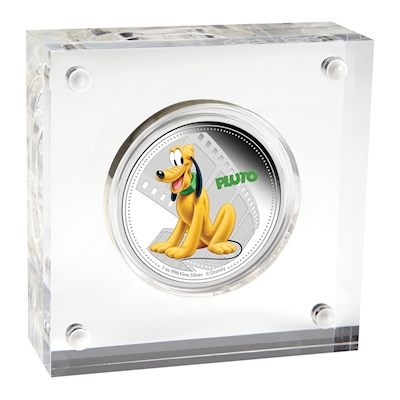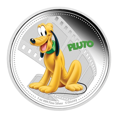 Pluto ist eine ungewöhnliche Figur in den klassischen Disney-Cartoons, da er im Gegensatz zu seinen Freunden nicht vermenschlicht dargestellt wird, sondern ein Tier bleibt. Als sein erster Auftritt gilt ein Film von 1930, in dem er allerdings noch nicht den Namen Pluto trug. Wie ein echter Hund knurrt und bellt er, um sich zu verständigen, nur seine Mimik trägt durchaus menschliche Züge. Als Tollpatsch, der immer wieder für komische Verwicklungen sorgt, gewann der Hund schnell die Herzen der Disney-Fans und gehört deshalb zu den Figuren, die für die kolorierte Silbermünzen-Serie ausgwählt wurden.