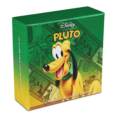 Die Silbermünzen-Serie „Mickey & Friends“ mit beliebten Disney-Figuren als Motiv kommt natürlich nicht ohne Mickeys besten Freund aus: seinen Hund Pluto. Nach Micky Maus und Minnie Maus, Donald und Daisy Duck sowie Goofy ist Pluto die sechste Ausgabe der Serie von kolorierten Sammlermünzen aus 1 oz Feinsilber. Wie die Vorgänger wird auch diese Edition in einer Auflage von insgesamt 10.000 Stück ausgegeben und ist vom Disney-Konzern lizensiert.